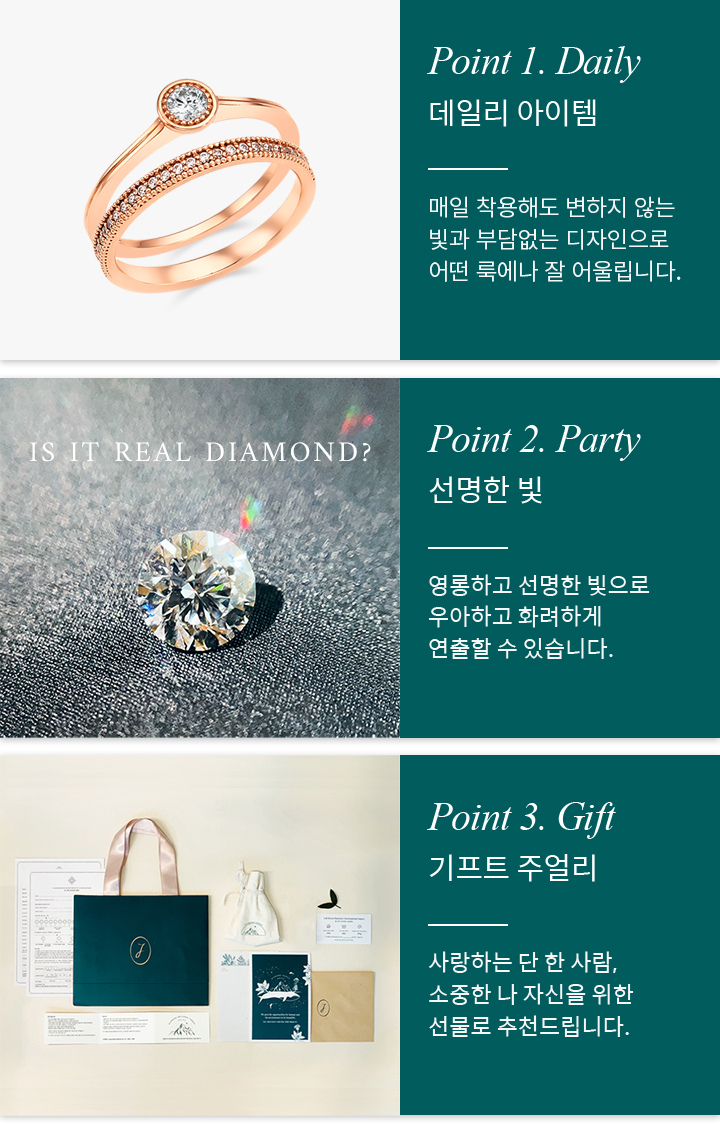 유사보석이 아닌 천연 다이아몬드와 물리적, 화학적, 광학적으로 100% 동일한 성분 입니다.