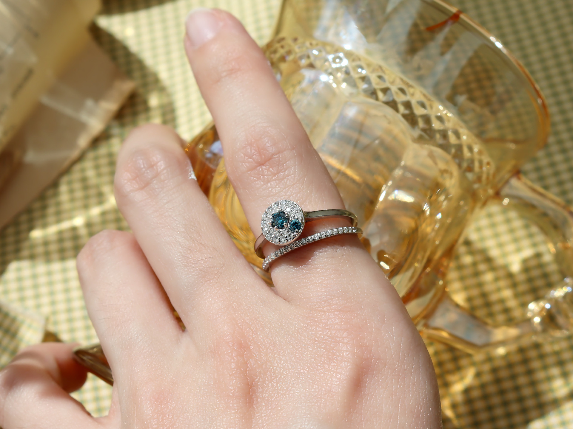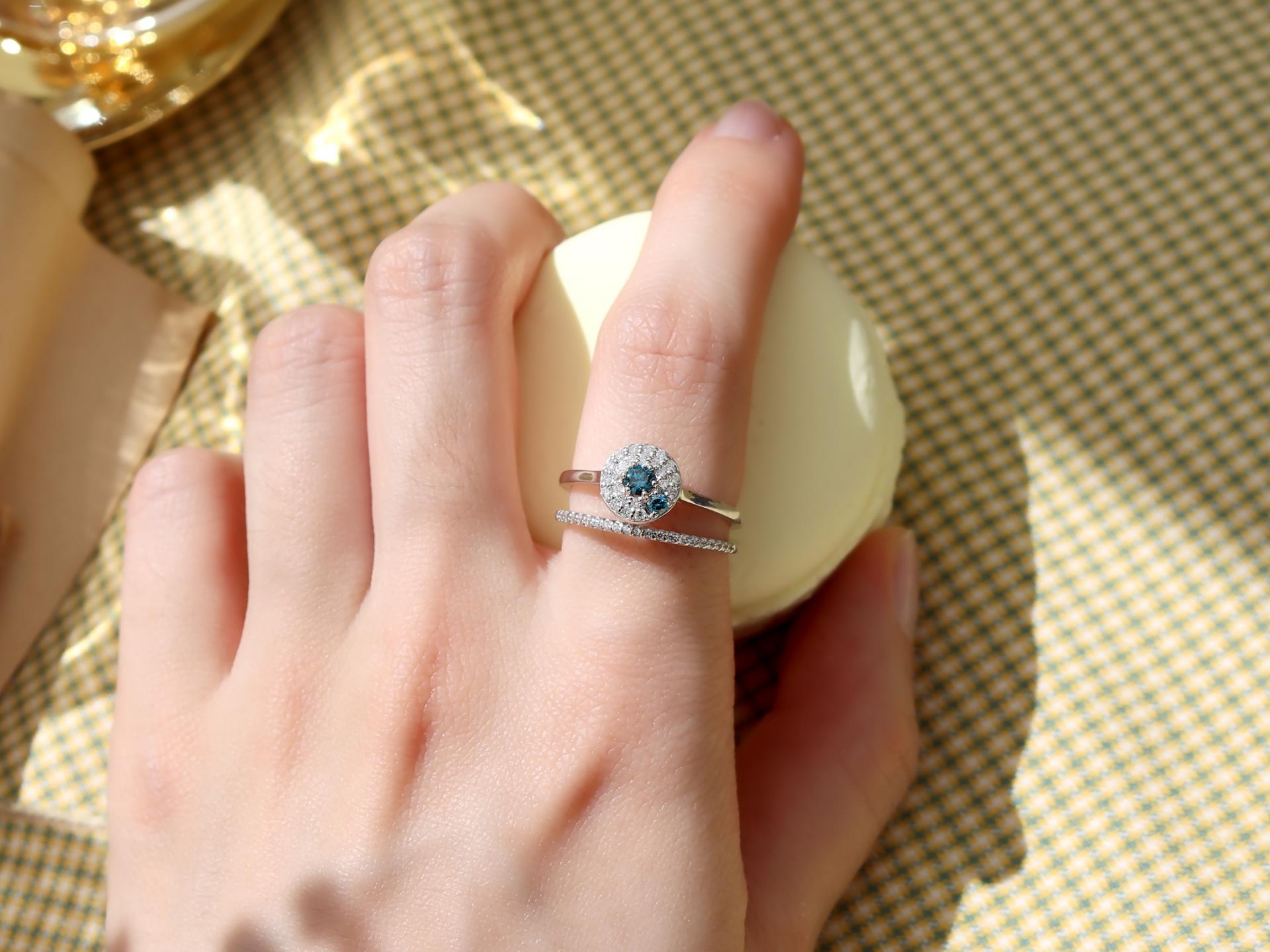 블루 다이아몬드와 투명한 다이아몬드 빛의 조화가 은은하지만 화사하게 손을 빛내줍니다.